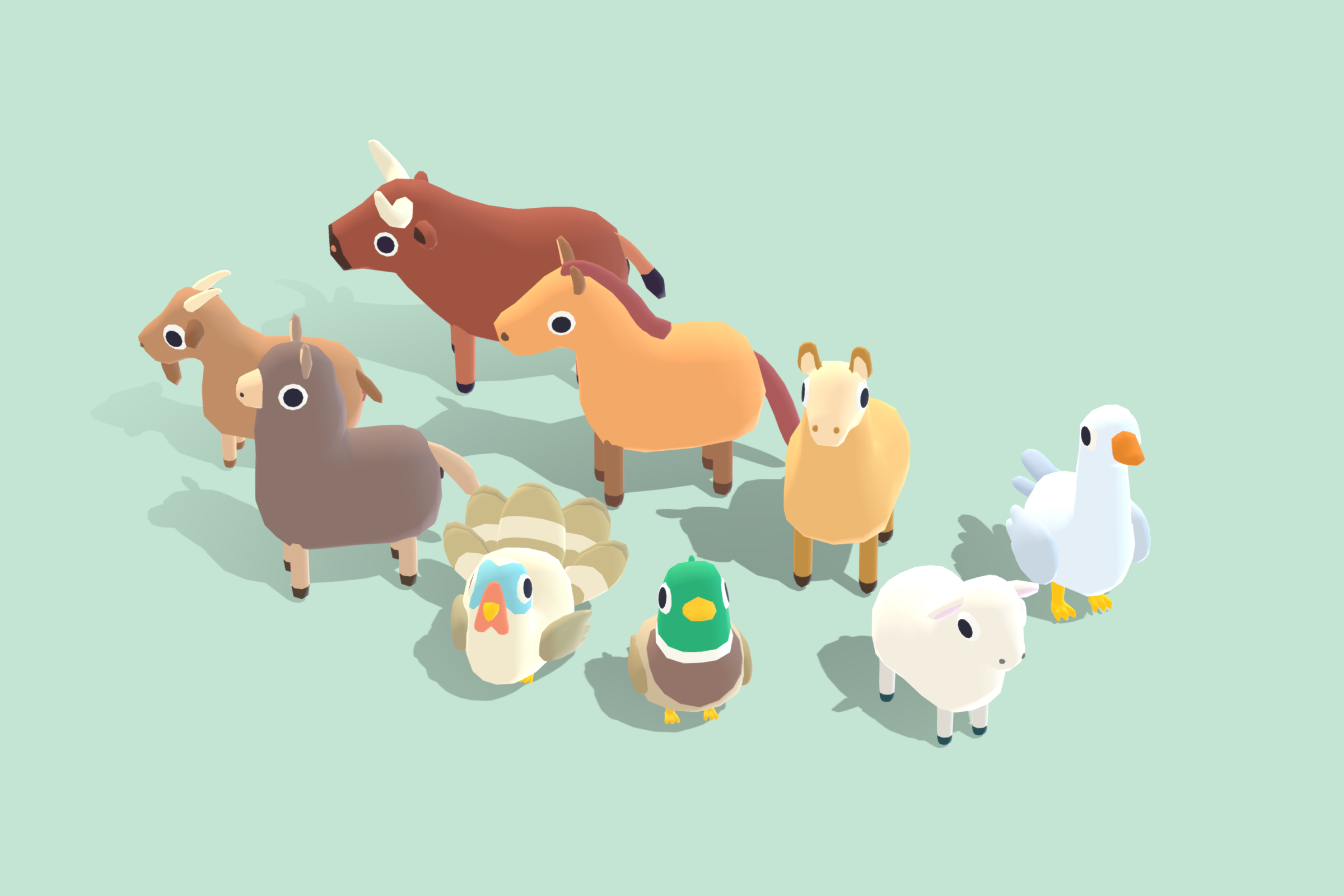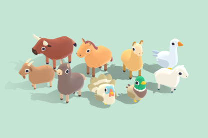 Alpaca, Bull, Goat, Goose, Horse, Lamb, Mallard, Turkey